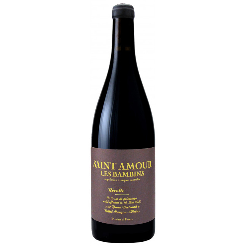 Saint-Amour Les Bambins 2024 du domaine Les Bertrand de Yann Bertrand est un vin rouge issu du cépage Gamay (100%), de vignes d'une cinquantaine d'années qui s'épanouissent sur la Côte de Besset sur les hauteurs de Saint-Amour. Après un tri rigoureux, et une macération carbonique de 17 jours, s'en suit un élevage en fûts pendant 8 mois.